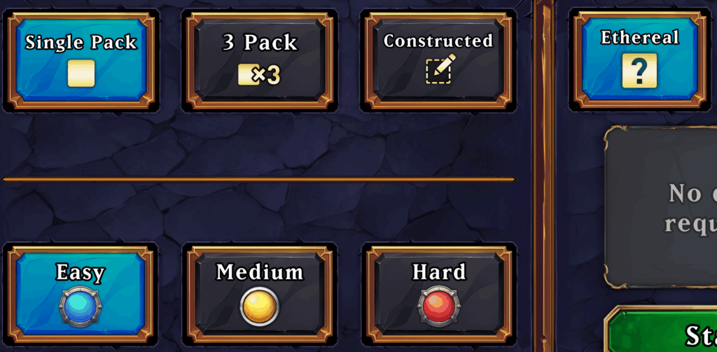 Play vs AI, however, gives you the best of both worlds.  You can pick the difficulty of your AI opponent, turns are untimed, and the matches follow the respective rules of the selected format.  Now your next question might be, which format should I try first?  My recommendation?  Single Pack, Ethereal.  Difficulty is up to you, but I’d probably start with Easy.