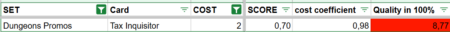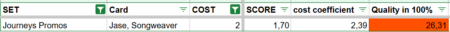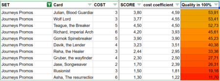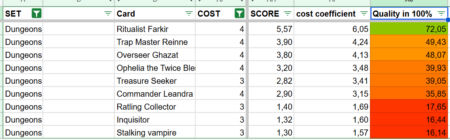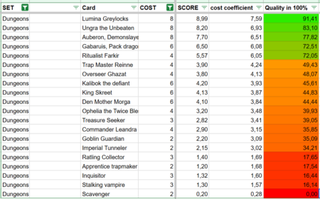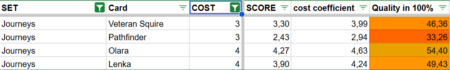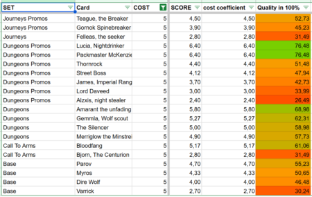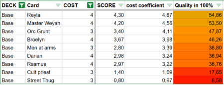 Beyond the total score, I introduced a cost coefficient. This compares a Champion’s total point value to its cost, giving a clearer picture of efficiency. In other words, it shows how much value you receive for what you pay. A Champion with a high total score may still be inefficient if the cost is too high, while a cheaper card with a slightly lower score might actually offer better value.