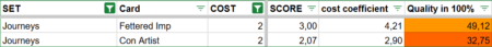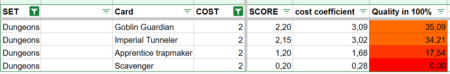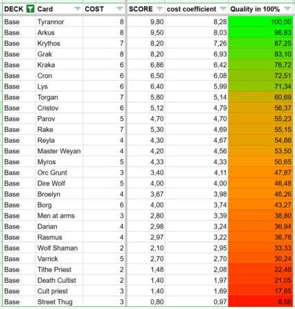 Using these criteria, I calculated a score for every card and then compared these scores to the card’s cost, resulting in a cost coefficient. Low-cost cards are slightly penalized in this system. This is intentional because a powerful high-cost card is often more valuable than multiple cheap cards with less impact.