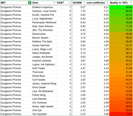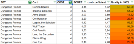All Champion cards are included in the list, along with nearly all of their relevant effects and statistics — such as draw, sacrifice, body, damage, gold generation, and cost. Each of these elements was assigned a fixed point value. The goal was to make the evaluation as uniform and objective as possible, so that every card is judged by the same standards.