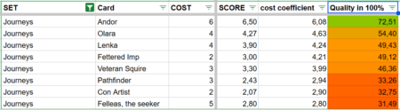 To make comparisons even clearer, I ranked all cost coefficients and converted them into a quality percentage. This makes it easy to see at a glance how a Champion performs relative to the rest of the list.