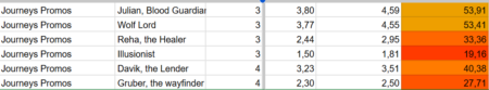 Call to Arms has low overall efficiency but a few standout champions. Journeys Promos scores